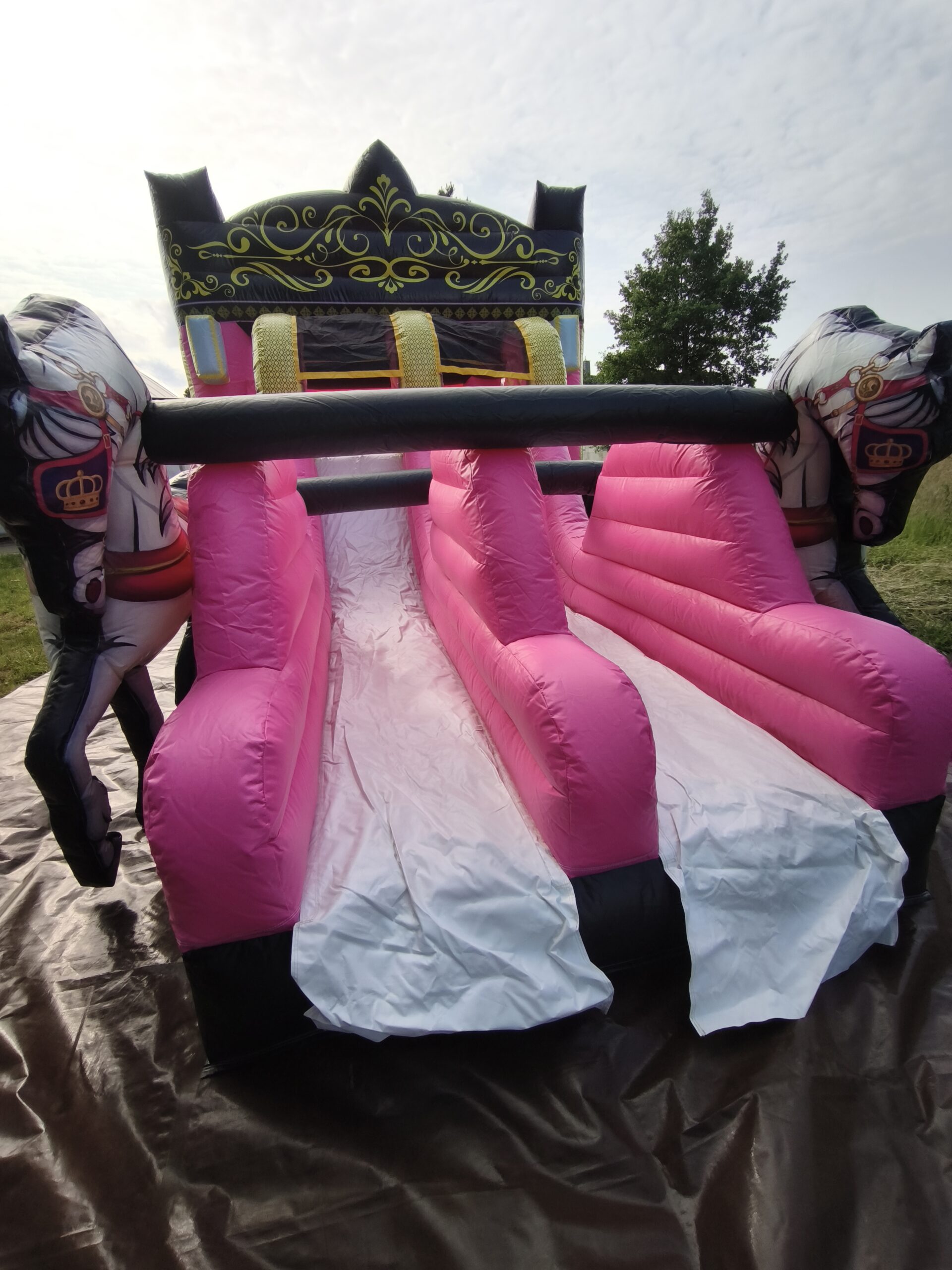 Eine besondere Hüpfburg für kleine Pferdekutschen-Fans. Die Kombination aus Hüpfburg, Hindernissen und Rutsche sorgt für jede Menge Spielspaß und lädt die Kinder zu fantasievollen Abenteuern ein.