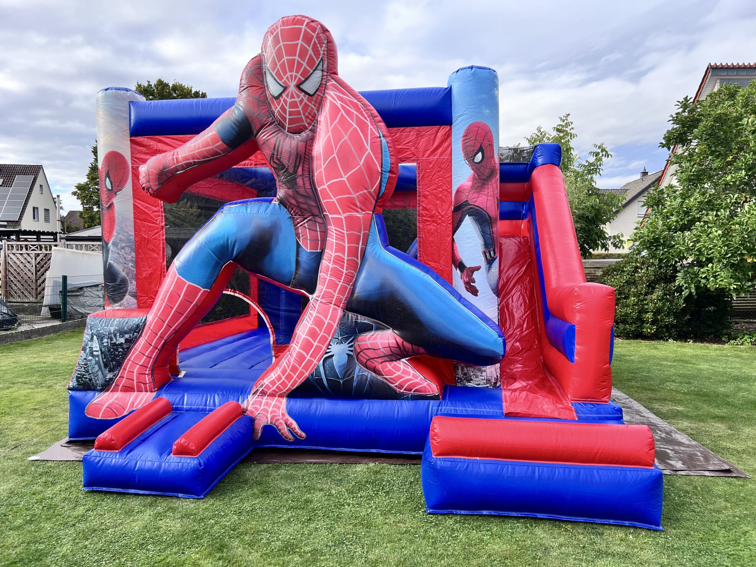 Perfekt für Kindergeburtstage – die Spiderman Hüpfburg mit einem großen Abbild der Actionfigur im Vordergrund. Innen befinden sich neben der großen Hüpffläche zwei kleine Säulen als Hindernisse und die Kletterwand die zur Außenrutsche führt.