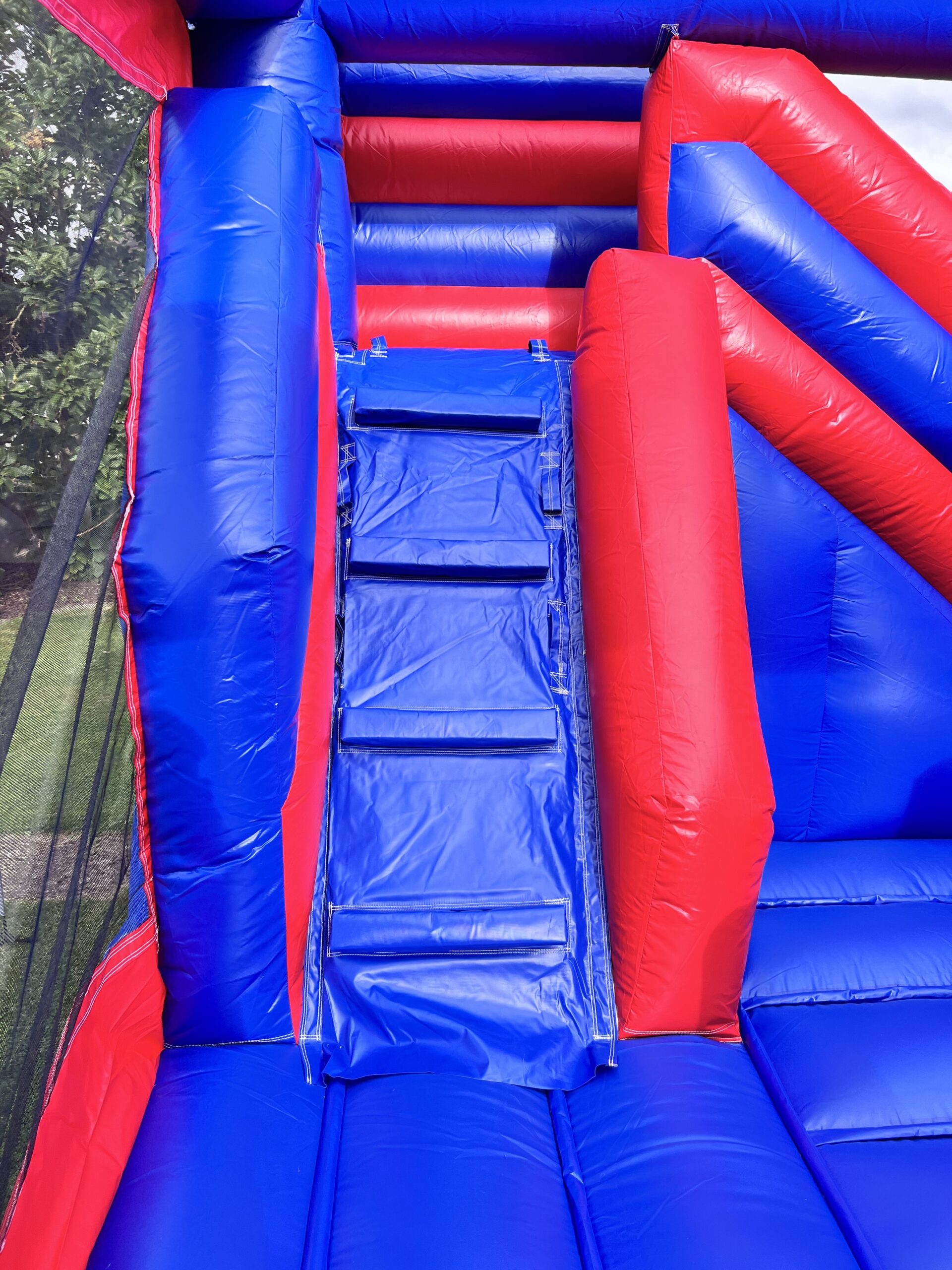 Perfekt für Kindergeburtstage – die Spiderman Hüpfburg mit einem großen Abbild der Actionfigur im Vordergrund. Innen befinden sich neben der großen Hüpffläche zwei kleine Säulen als Hindernisse und die Kletterwand die zur Außenrutsche führt.